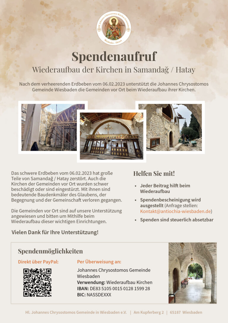 Homeantiochia-wiesbaden2026-04-13T13:53:12+02:00 Herzlich Willkommen auf der Homepage von der Gemeinde Johannes Chrysostomos aus Antiochia Spendenaufruf: Gemeinsam Kirchen wiederaufbauen Unterstützen Sie den Wiederaufbau der zerstörten Kirchen in Samandag/Hatay und helfen Sie, Orte des Glaubens und der Gemeinschaft neu entstehen zu lassen News Palmsonntag 2026OstertermineSpendenaufruf mehr ... Gemeindearbeit Mit einem gut aufgebautem Vorstand und mit mehr als 250 Mitgliedern bilden wir aktuell die Gemeinde in Wiesbaden. Integration Ziel ist es, die neuen Gemeindemitglieder möglichst optimal aufzufangen und zu integrieren. Jugend und Kinder Die Kinder- und Jugendbetreuung liegt uns sehr am Herzen. Hier leisten unsere Jugendleiter und Betreuer eine vorbildliche Arbeit. Standort Am Kupferberg 2d65187 Wiesbaden Kontakt Mobil: 0172 237 2768Email: ey@antiochia-wiesbaden.de Kontaktformular Bitte aktiviere JavaScript in deinem Browser, um dieses Formular fertigzustellen.Name *VornameNachnameE-Mail *Kommentar oder Nachricht *Absenden